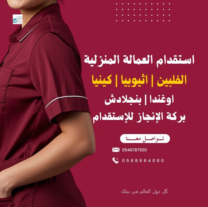 مكتب بركة الانجاز للاستقدام، نوفر لك عمالة منزلية متميزة من عدة دول، عقود موثقة رسمية، سرعة وانجاز المعاملة، متابعة مستمرة حتى وصول العاملة وبعد وصولها، نقدم لك خدمة نقل خدمات العمالة المنزلية متاحة لكافة العملاء المكتب وعملاء المكاتب الأخرى، متاح الفلبين وأثيوبيا وكينيا وأوغندا وبنجلادش، العنوان الرياض، اليرموك مخرج 9 طريق الصحابة، تواصل معنا