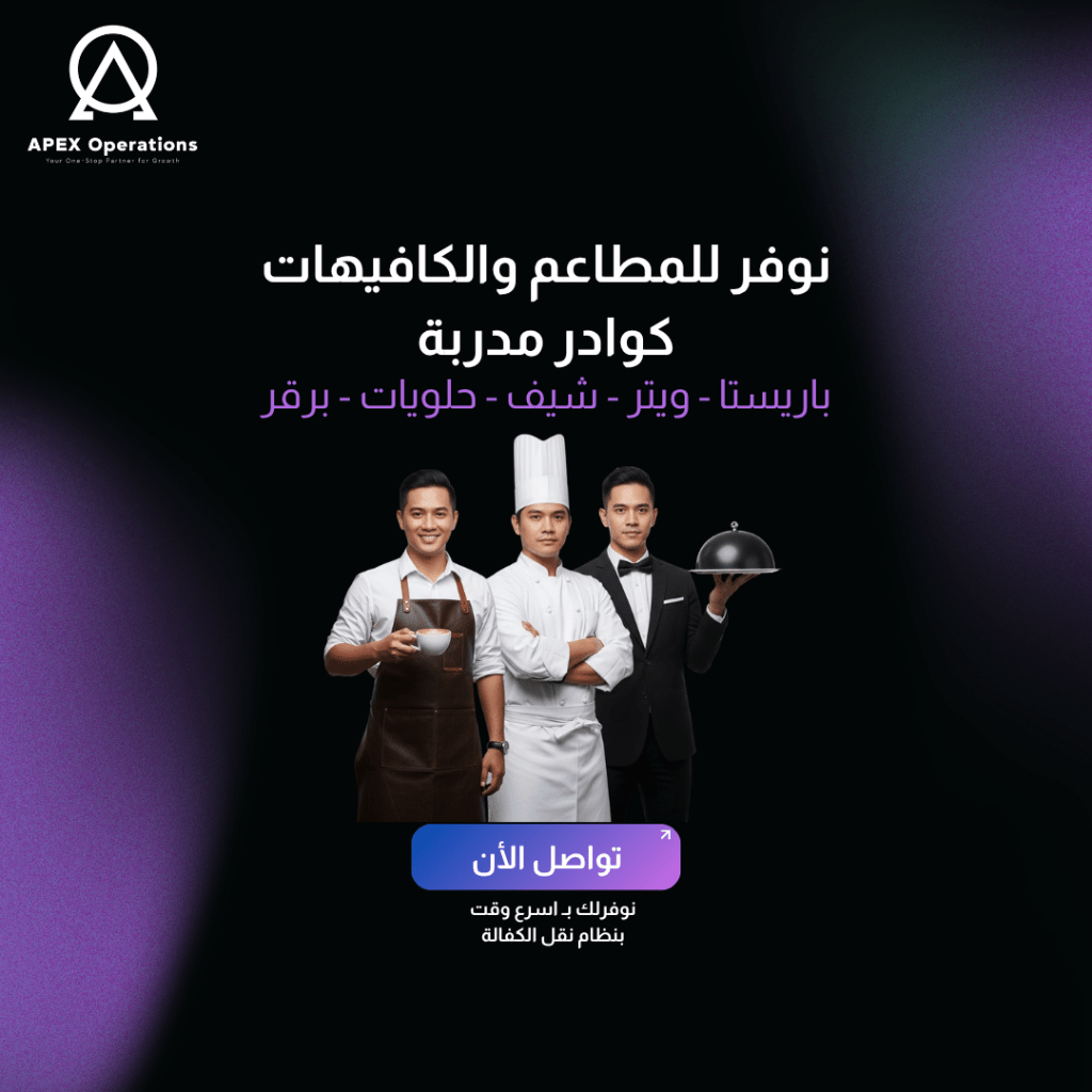 For Restaurants and Cafes Only At Apex Operations, we provide professional and trained staff for the hospitality sector from various nationalities (Transfer Iqama) Available Roles Chef (Burger, Pastry, all types) Barista - Waiter - Cashier - Supervisors & Operation Managers - Prep & Cleaning Staff - General Worker. Consultations for Restaurants & Cafes Contact Us