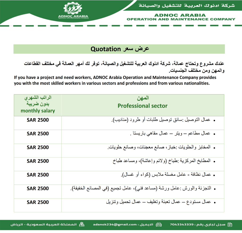 If you have a project and need workers, ADNOC Arabia Operation and Maintenance Company provides you with the most skilled workers in various sectors and professions and from various nationalities