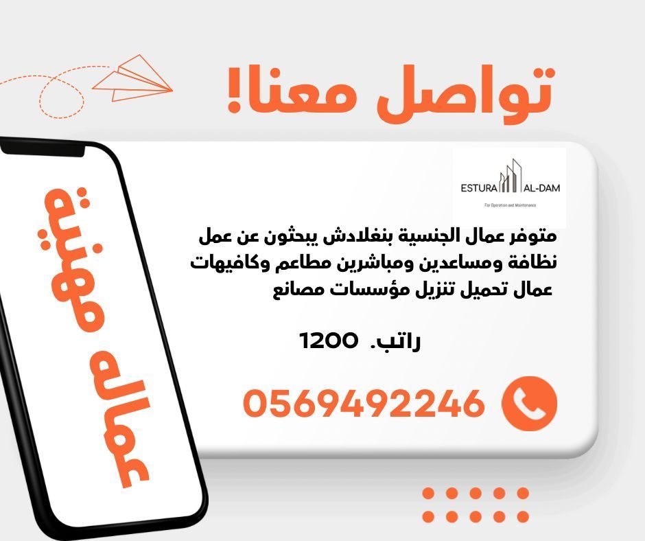 موجود عمال بنقال للنقل الفوري جاهزة للعمل بالمطاعم والكافيهات والمصانع والمولات شكل مقبول وصغار بالعمر وإقامة سارية مع التجربة أسبوع رواتب تبدأ من 1200 وامكانية استبدال أي عامل خلال فترة التجربة