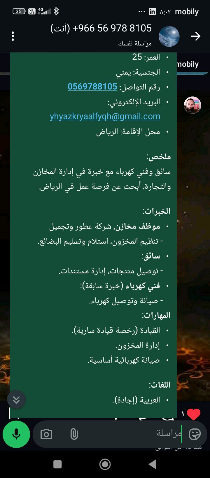 العمر 25 - الجنسية يمني - رقم التواصل 0569788105 - محل الإقامة الرياض ملخص سائق وفني كهرباء مع خبرة في إدارة المخازن والتجارة، ابحث عن فرصة عمل في الرياض. اشتغلت موظف مخازن شركة عطور وتجميل - تنظيم المخزون، استلام وتسليم البضائع. سائق توصيل منتجات، إدارة مستندات. خلفية في كهرباء