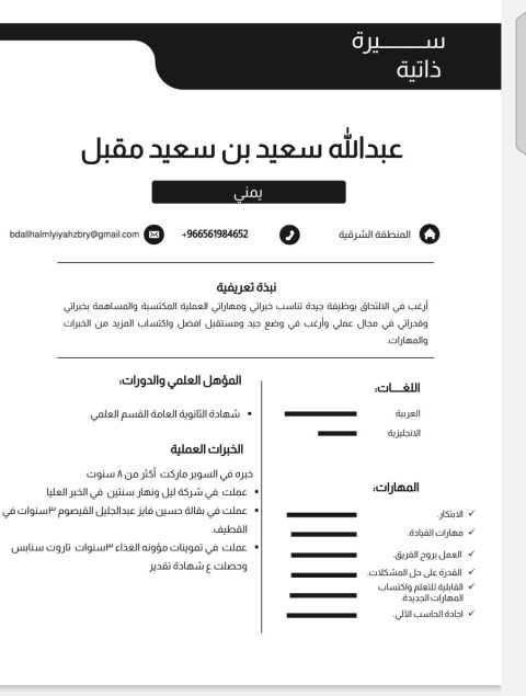 ابحث عن عمل لدي خبرة في السوبرات عملت كاشير ومشرف صالة وأمين مستودع اقامتي سارية وكرت صحي موجود ومستعد للعمل في أي مكان الجنسية يمني