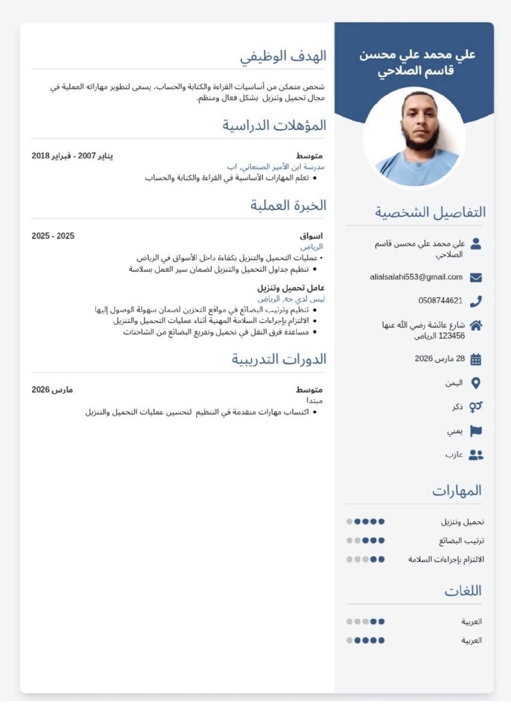 أنا عامل تحميل وتنزيل عندي خبرة في عمل في مستودع أو في قسم خضروات أو في أسواق أو في بقالة أو أشغال أخرى ملاحظة عندي إقامة سارية وشهادة صحية دراسة