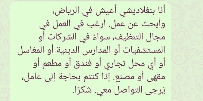 أنا بنغلاديشي أعيش في الرياض، وابحث عن عمل. أرغب في العمل في مجال التنظيف، سواء في الشركات أو المستشفيات أو المدارس الدينية أو المغاسل أو أي محل تجاري أو فندق أو مطعم أو مقهى أو مصنع. اذا كنتم بحاجة الى عامل، يرجى التواصل معي. شكرا