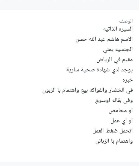 I am Hashem, a young Yemeni man looking for work. I have experience in vegetables, groceries, markets, delivery services, or roastery. I have a valid health certificate from Riyadh. I am new and looking for work