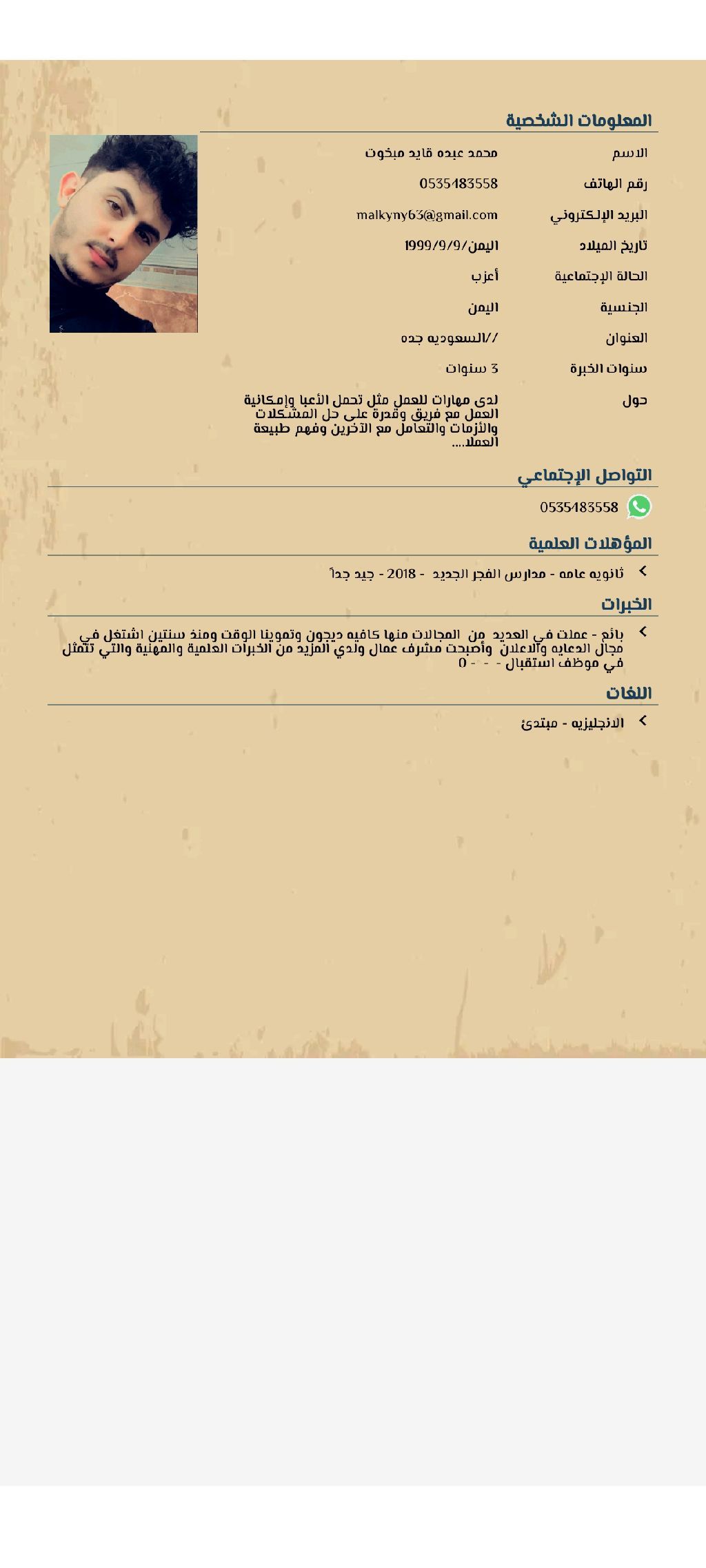 اسمي محمد عبده من اليمن عمري 22 مقيم في السعودية (جدة) ابحث عن عمل لدي خبرة في عدة مجالات منها (استقبال مطاعم وفنادق وكافي كاشير عامل في تموينات أو سوبر ماركت وفي مجالات أخرى) أجيد التعامل مع الزبائن وتحمل ضغوط العمل اقامتي سارية