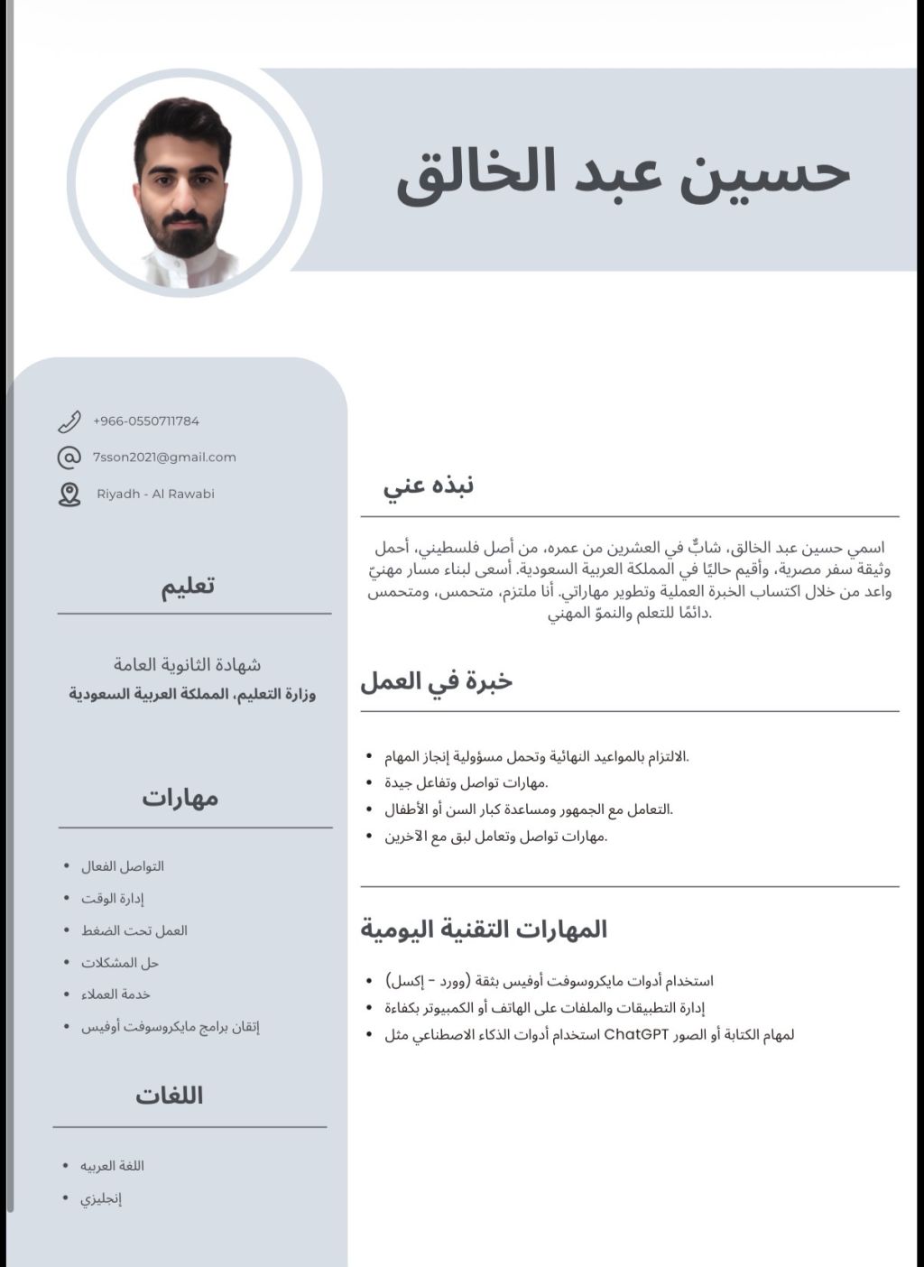 باحث عن فرصة عمل (دوام صباحي) أنا شاب جاهز للعمل فورا، ابحث عن وظيفة بدوام صباحي في أي مجال. أتميز بالالتزام، سرعة التعلم، وتحمل ضغط العمل، وأقدر اشتغل ضمن فريق أو بشكل مستقل عندي استعداد أتعلم أي مهارة جديدة وأتطور في بيئة العمل، وأهم شيء عندي أني أكون عنصر مفيد وأضيف قيمة للمكان متفرغ للفترة الصباحية، مرن في طبيعة العمل (مبيعات، كاشير، استقبال، مستودع، وغيرها) جاد ومنضبط في الحضور والعمل