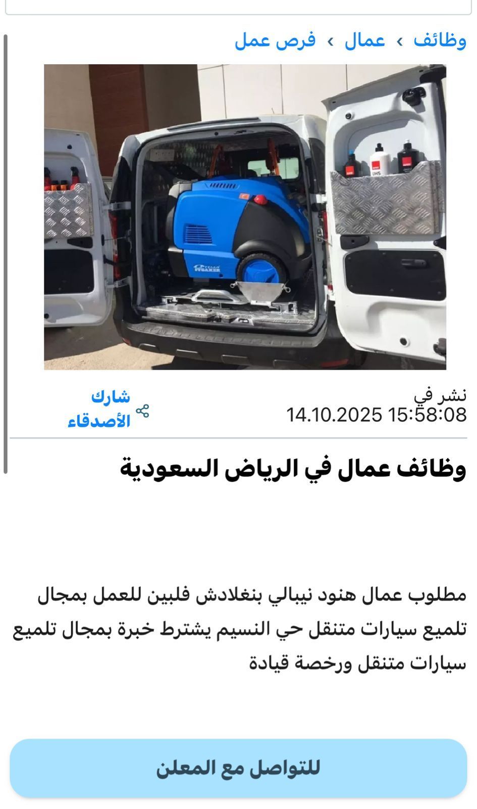 مطلوب عمال تلميع وغسيل سيارات متنقل حي النسيم الرياض شرط وجود خبرة بمجال تلميع متنقل ورخصة قيادة