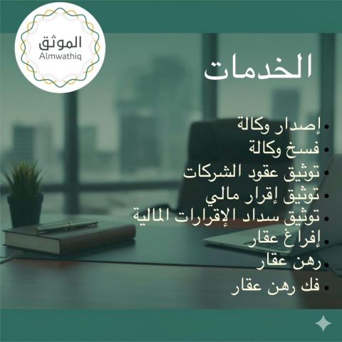 موثقة مرخصة من وزارة العدل لكافة خدمات التوثيق) بموجب ترخيص عدلي رقم 47111097 لخدمات التوثيق اصدار الوكالات للموقوفين والسجناء بمنطقة الرياض - اصدار الوكالات وفسخها (أفراد - شركات - مؤسسات) توثيق عقود تأسيس الشركات - توثيق الافراغات العقارية - الرهن العقاري وفكه وتعديله - توثيق الاقرارات المالية الرياض