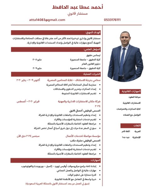 محامي ومستشار قانوني، وقاضي سوداني عملت بالمحاماة منذ 2004 حتى 2009 ثم التحقت قاضي بالسلطة القضائية في السودان منذ 2009 وحتى الآن ثم عملت في مكتب محاماة في جدة بالمملكة العربية السعودية ملم بالأنظمة السعودية والكمبيوتر وأجيد كتابة كافة أنواع المذكرات والعقود والاستشارات القانونية واستخدام الحاسوب ممارسة في المجال منذ 20 عام أرغب في العمل في شركة أو مكتب محاماة في أي مدينة في السعودية