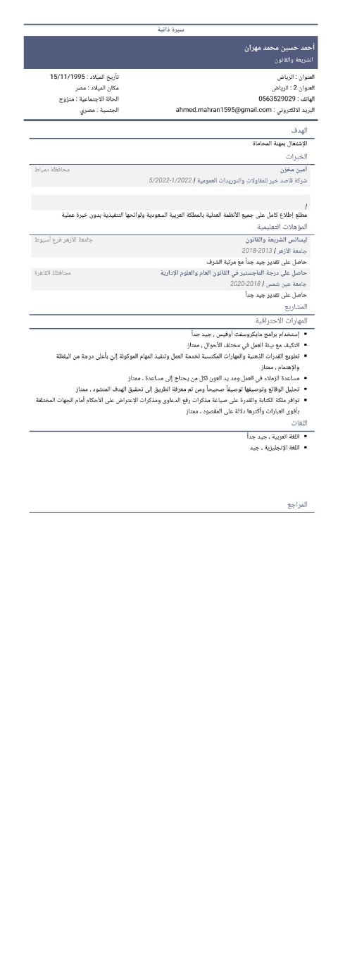 الاسم أحمد محامي مصري مستشار قانوني حاصل علي درجة الماجستير خبرة عملية بالمحاماة 17 عاما منها خمس سنوات تشرفت بالعمل كمستشار قانوني لعدد من مكاتب المحاماة وشركات المحاماة بمدينة الرياض وتشمل خبرتي في كافة التخصصات القانونية منها القضايا التجارية والمدنية والجنائية والأحوال الشخصية والعم لوصياغة العقود، وتقديم استشارات قانونية التعامل مع كافة المنصات القانونية منها منصة ناجز ومعين وتراضي ونافذ