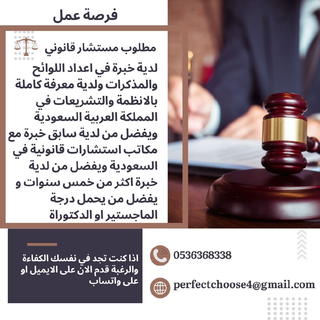 مطلوب على وجه السرعة للعمل في الرياض حي الملز مستشار قانوني لديه الخبرة في اعداد اللوائح والمذكرات ولدية معرفة كاملة بالأنظمة والتشريعات في المملكة العربية السعودية ويفضل من لدية سابق خبرة مع مكاتب استشارات قانونية في السعودية ويفضل من لديه خبرة أكثر من خمس سنوات ويفضل من يحمل درجة الماجستير أو الدكتوراه