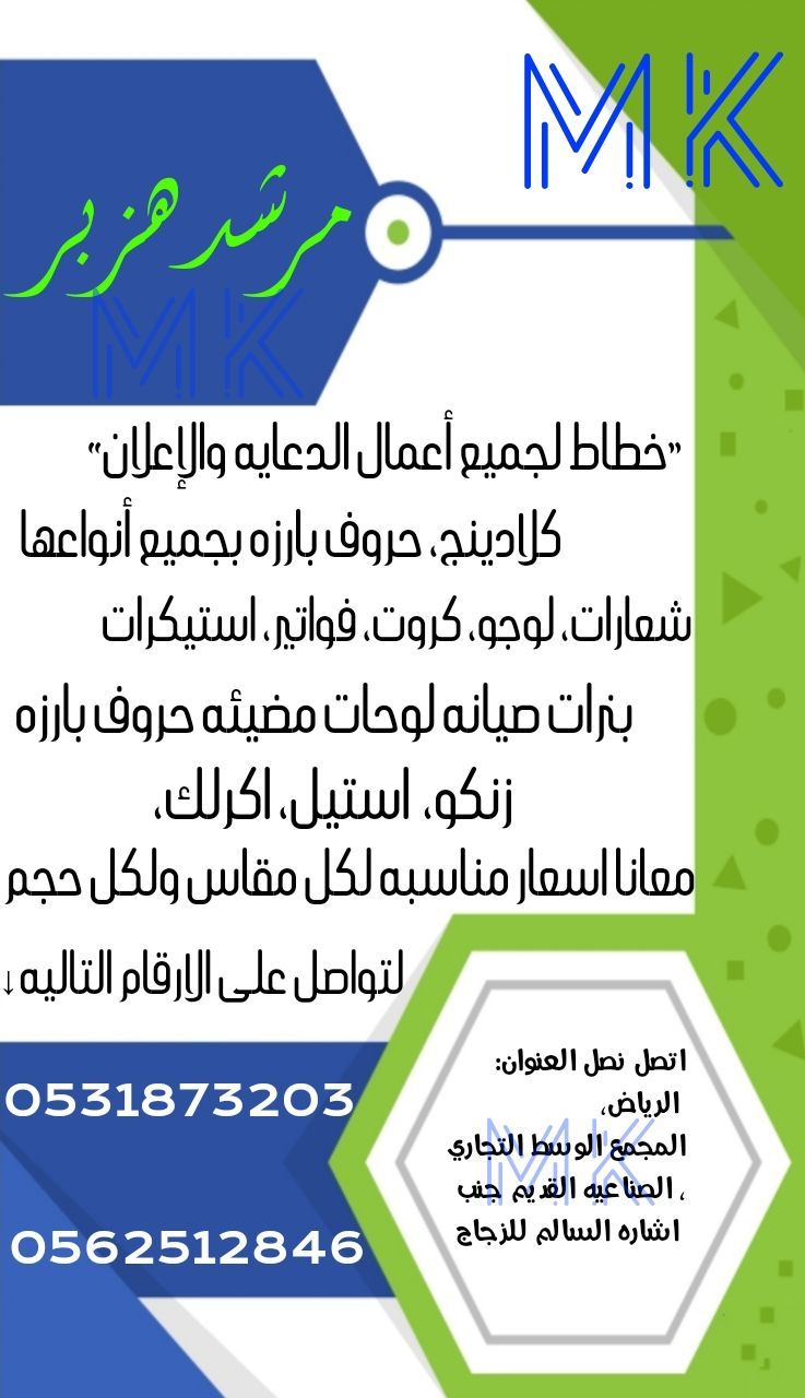 خطاط لجميع أعمال الدعاية والاعلان واجهات وأعمال لوحات كلادينج. حروف بارزة بجميع أنواعها جميع أنواع التصاميم تصميم هويات تجاريه تصميم شعارات لوجو كروت فواتير ستيكرات بنر فلكس العنوان الرياض - المجمع الصناعي - اشارة السالم