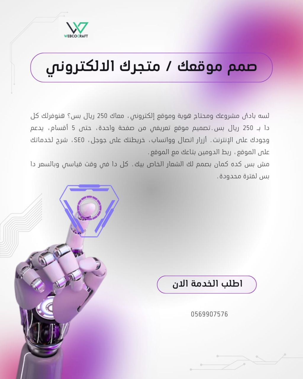 لسه بادئ مشروعك ومحتاج هوية وموقع الكتروني، معاك 250 ريال بس شركة ويب كو كرافت هتوفرلك كل دا ب 250 ريال بس. تصميم موقع تعريفي من صفحة واحدة، حتى 5 أقسام، يدعم وجودك على الانترنت. أزرار اتصال وواتساب، خريطتك على جوجل، SEO، شرح لخدماتك على الموقع، ربط الدومين بتاعك مع الموقع. مش بس كده كمان بصمم لك الشعار الخاصبيك كل دا في وقت قياسي وبالسعر دا بس لفترة محدودة