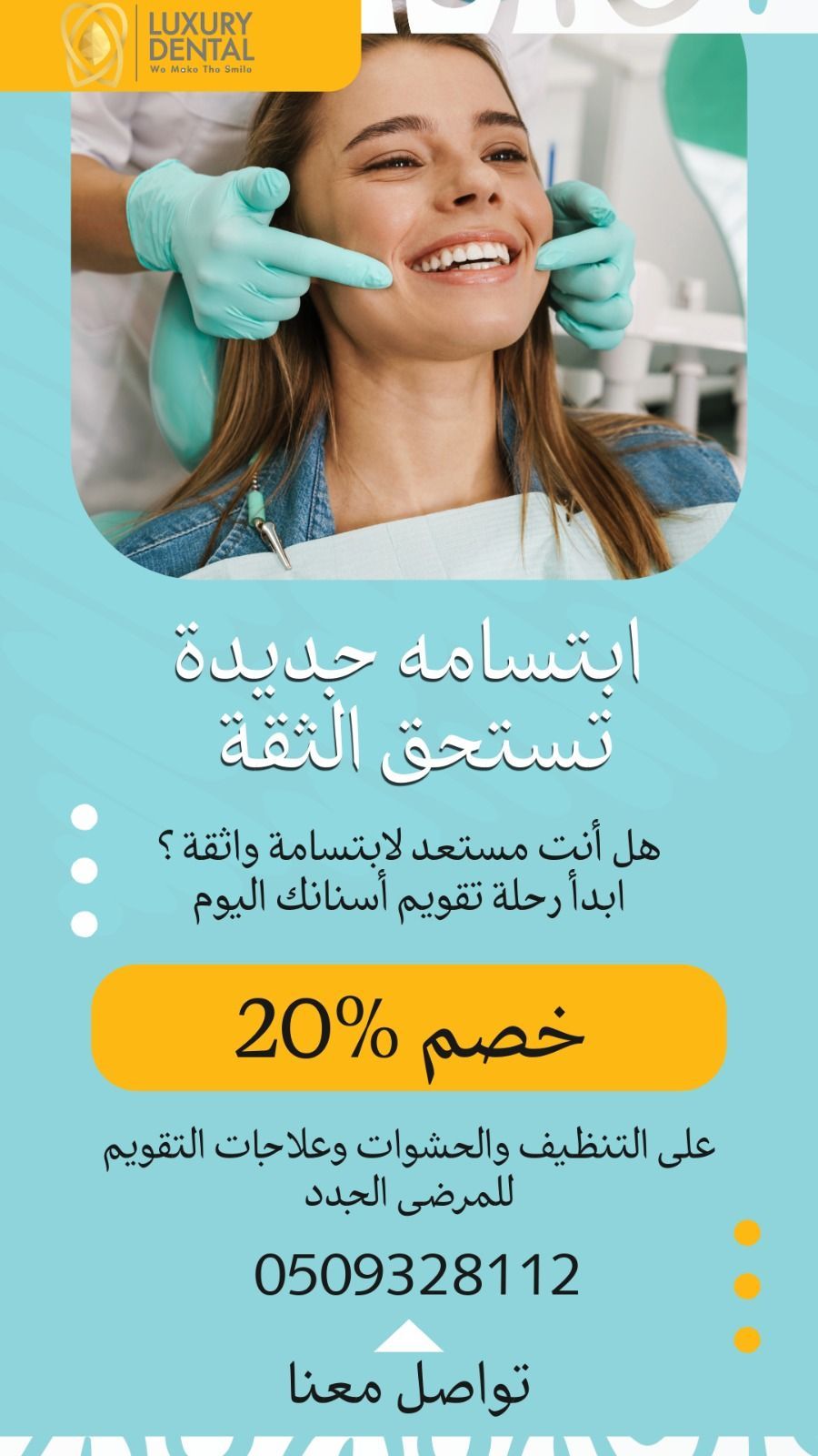 ابتسامتك سر ثقتك هل تبحث عن عناية متكاملة لأسنانك نحن نقدم لك أفضل خدمات طب الأسنان بأحدث الاجهزة وعلى يد أطباء متخصصين تنظيف وتلميع الأسنان حشوات وعلاج التسوس تبييض الأسنان تركيبات وتجميل الأسنان علاج العصب بدون الم جودة عالية أسعار مناسبة اهتمام براحتك أولا احجز موعدك الآن وابدأ رحلتك نحو ابتسامة أجمل للتواصل أكتب رقمك هنا