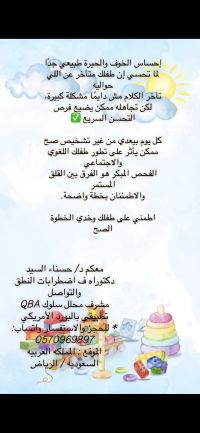 معكم د حسناء السيد دكتوراه في اضطرابات النطق والتواصل مشرف محلل سلوك QBA تطبيقي بالبورد الأمريكي بقدم جلسات تخاطب وتأهيل نفسي منزلية لمساعدة طفلك أنه يعبر عن نفسه بثقة، ويتطور وهو في مكانه الآمن للحجز والاستفسار واتساب الموقع المملكة العربية السعودية / الرياض