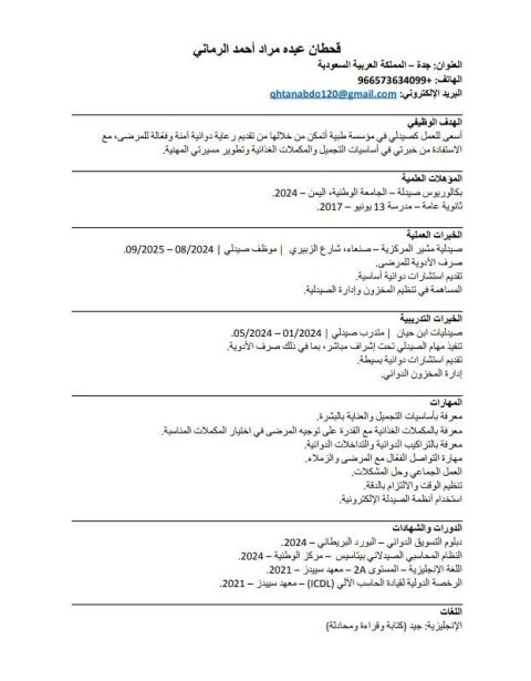 أنا الصيدلاني قحطان الرماني يمني الجنسية يبحث عن فرصة عمل بحيث امتلك ترخيص ساري وإقامة سارية ولدي خبرة في صرف الادوية ومنتجات التجميل والمكملات الغذائية