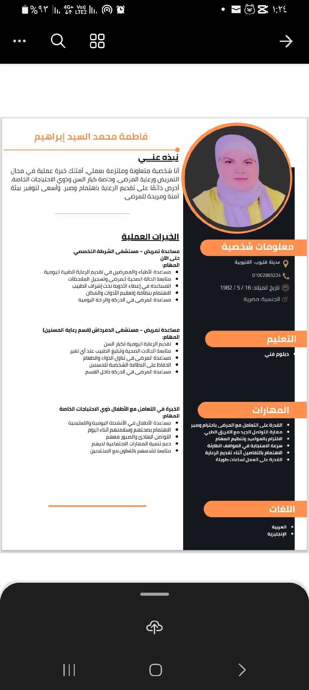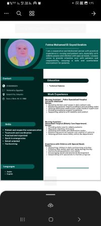 ممرضة مصرية تشتغل تحت ضغط تمتلك خبرة كبيرة ورائعة في الطوارئ والصحة العامة وأقدم رعاية صحية شاملة والتنسيق مع الفرق الطبية متنوعة التخصصات وتثقيف المرضى وذويهم حول إدارة الأمراض والرعاية المنزلية بعد الخروج من المستشفى والالتزام الصارم بمعايير مكافحة العدوى والسلامة المهنية والصحية وحاصلة على دورات صحية وتثقيفية شاملة والتعامل مع كبار السن ومتابعه العمليات الجراحية والتعامل مع قرح الفراش