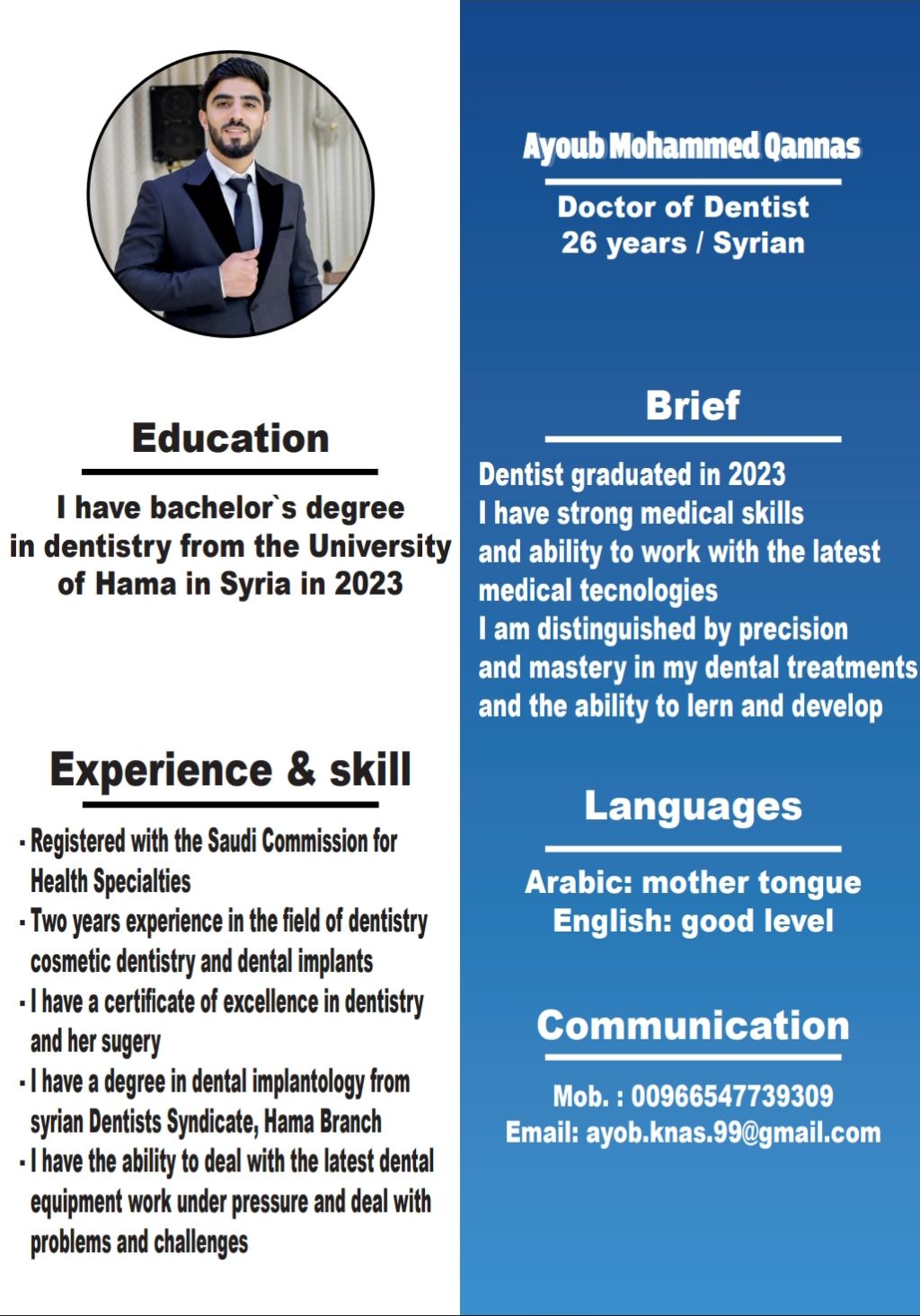 طبيب أسنان عام سوري خريج 2023 قادر على انجاز جميع أنواع المعالجات السنية خبرة سنتين داخل سوريا سنة امتياز دورة في زراعة الأسنان