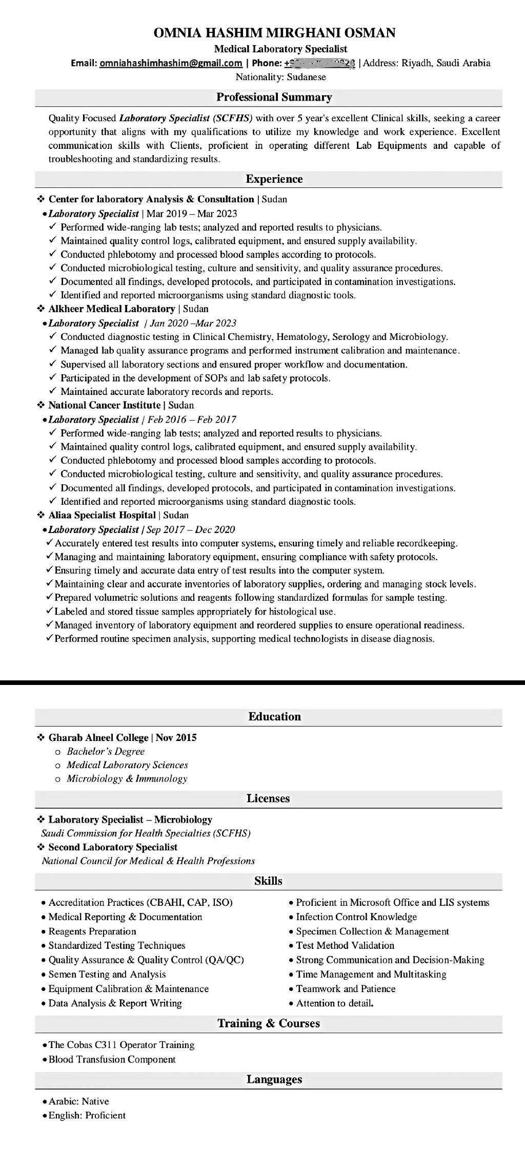 أخصائية مختبرات طبية. لا زالت تعمل متطوعة في مستشفى الايمان في الرياض. يوجد إقامة يوجد امتحان الهيئة نجاح بامتياز، تبحث عن عمل
