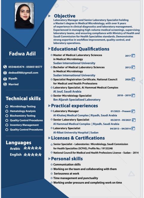 فني مختبر طبي يبحث عن فرصة عمل حاصل على تصنيف الهيئة - فني مختبر (ساري) وإقامة سارية، خبرة 10 سنوات داخل السعودية وخارجها. المهارات سحب الدم للاطفال وحديثي الولادة اتقان العمل على اجهزة ELISA SNIBE - Cobas 411 - Cobas 400 integra - Cobas c111 - Selectra - Mindray (CBC وكيمياء) خبرة في ادارة المستشفيات حاصل على دبلوم ادارة مستشفيات والخدمات صحية جاهز لنقل الكفالة فورا