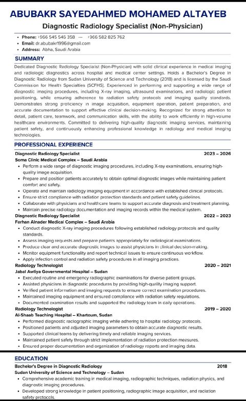 أخصائي أشعة تشخيصيه غير طبيب وحاصل على ترخيص الهيئة السعودية للتخصصات الصحية متوفر نقل فور الاتفاق خبرة في مجال الأشعة أكثر من 4 سنوات داخل السعودية و4 سنوات خارج السعودية مع وجود خبرة في مكافحة العدوى إقامة سارية أكثر من سنة متاح للعمل في كل أماكن المملكة