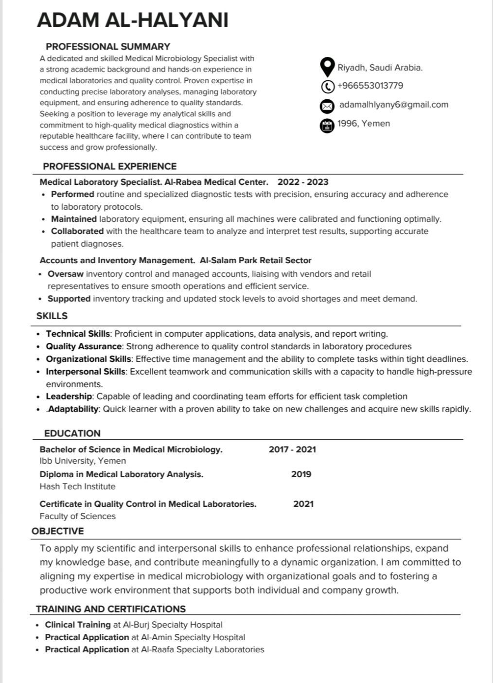 خريج ميكروبيولوجي طبي خبرة في الفحوصات المخبرية سنتين خبرة في الحسابات واعداد التقارير وتقفيل الحسابات خبرة في الاستقبال والاشراف الفندقي هدفي دائما تطوير ورقي المكان أو الشركة اللتي اعمل فيها