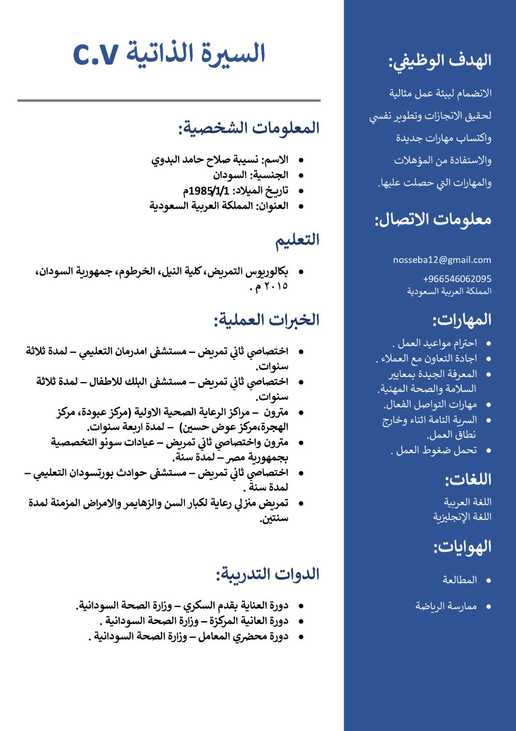 ممرضة سودانية درجة البكالوريوس في التمريض لدي خبرة عملية واسعة في مستشفيات ومراكز رعاية صحية متعددة، بالاضافة الى خبرة عميقة في تقديم الرعاية التمريضية المنزلية للمرضى، الاطفال، وكبار السن. أتميز بالالتزام التام بقيم الأمانة، الصدق، والاخلاص في العمل