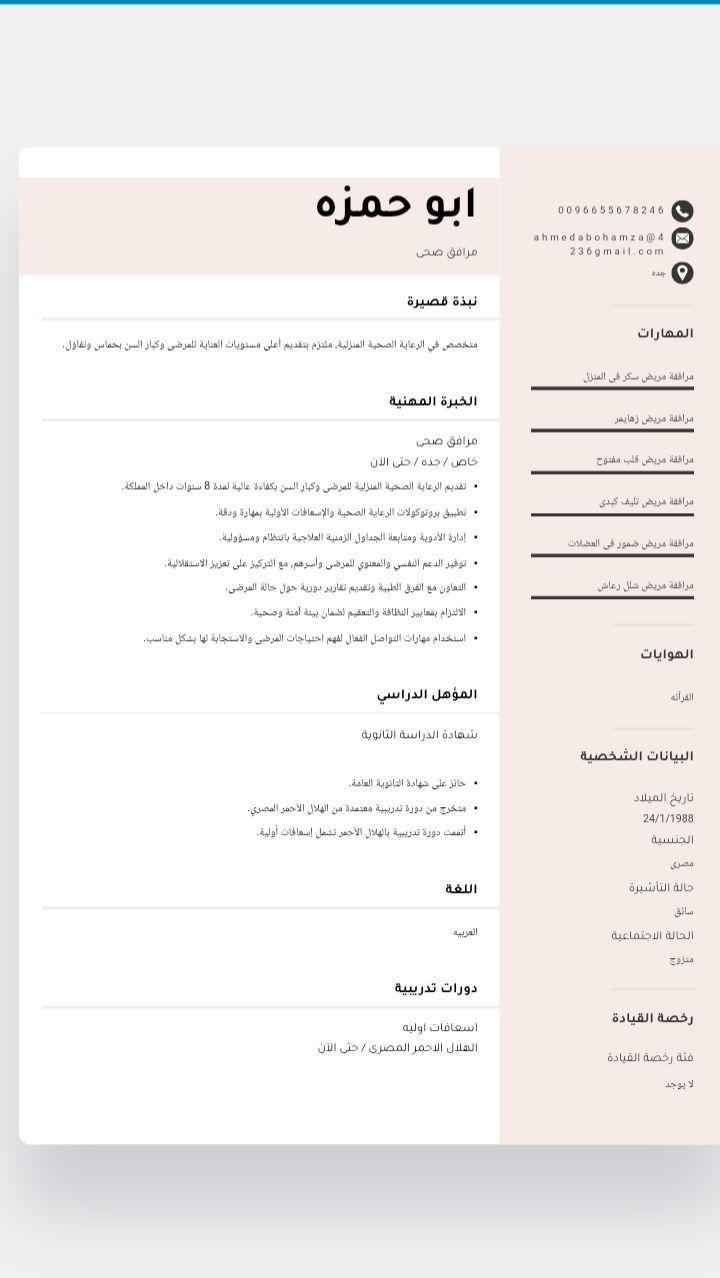 مرافق صحي للمرضى وكبار السن وزوي الاحتياجات الخاصه خبرة 8 سنوات بالمملكة ملم بكل احتياجات المريض. تنظيم مواعيد الادوية والابر قياس الضغط والسكر والأكسجين تغيير جروح قرح الفراش بأنواعها تمارين علاج طبيعي الحالات النفسيه الاطفال المعاقين خبرة في تعامل المستشفيات تنويم ومتابعت الدكتور المختص والخروج من المستشفى الاهتمامات الشخصيه