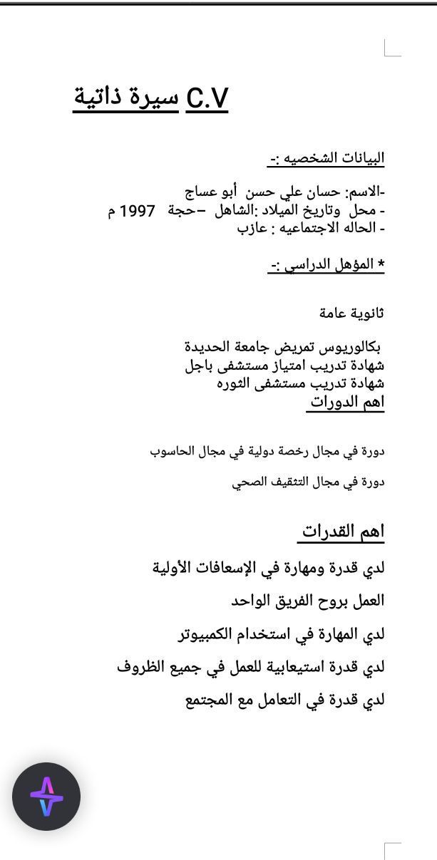 ابحث عن عمل في الرياض تمريض بكالريووس CV سيرة ذاتية البيانات الشخصيه الاسم حسان علي حسن أبو عساج - محل وتاريخ الميلاد الشاهل - حجة. 1997م - الحالة الاجتماعيه عازب المؤهل الدراسي ثانوية عامة بكالوريوس تمريض جامعة الحديدة شهادة تدريب مستشفى الثورة شهادة تدريب مستشفى باجل أهم الدورات دورة في مجال رخصة دولية في مجال الحاسوب دورة في مجال التثقيف الصحي أهم أل
