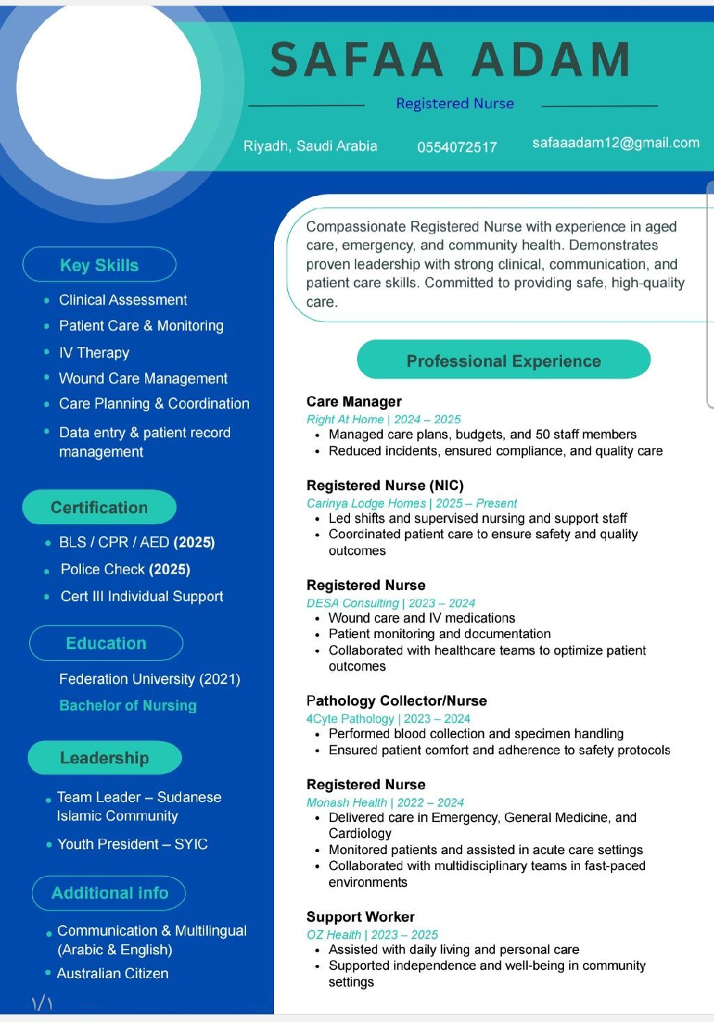 Compassionate Registered Nurse with 5 years of experience across aged care, emergency, and community health. Australian - trained (Bachelor of Nursing, Federation University) with strong leadership, communication, and patient care skills. Committed to delivering safe, high - quality care. BLS/ CPR/ AED certified, multilingual (Arabic & English) and experienced in team leadership within the communi