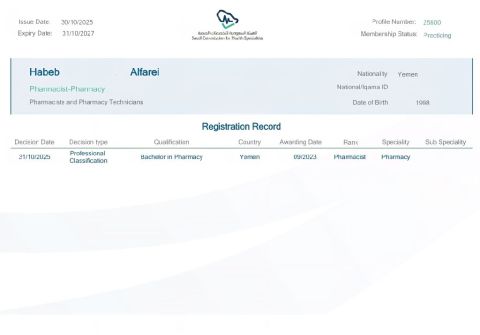 صيدلي مرخص - جاهز للعمل فورا. صيدلي يمني مقيم، حاصل على التصنيف المهني السعودي، وقابل لنقل الكفالة فورا. لدي خبرة عملية وكفاءة عالية في إدارة الصيدليات، صرف الوصفات، التعامل مع الأنظمة، وخدمة العملاء. متاح للعمل في مختلف مناطق المملكة
