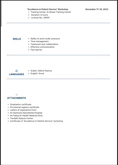 فني تمريض عندي تصنيف من الهيئة السعودية. عملت ممرضا في مستشفيات كبرى عملت لمدة تزيد عن 10 سنوات في مستشفى الأمراض النفسيه والعصبيه وعلاج الآدمان عملت في مركز قلب في أقسام باطنية وجراحه القلب عملت في أقسام الطوارئ وأمراض الدم