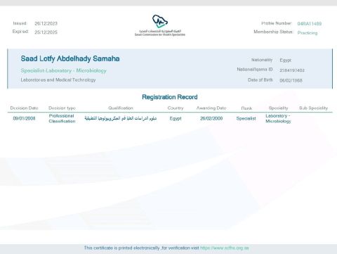 Alaa Saad Eid, a nursing technician with 4 years of experience in emergency and intensive care, holds Dataflow and Prometric certifications, a Saudi classification, and a BLS - certified course from the American College of Cardiology. Ready for sponsorship transfer