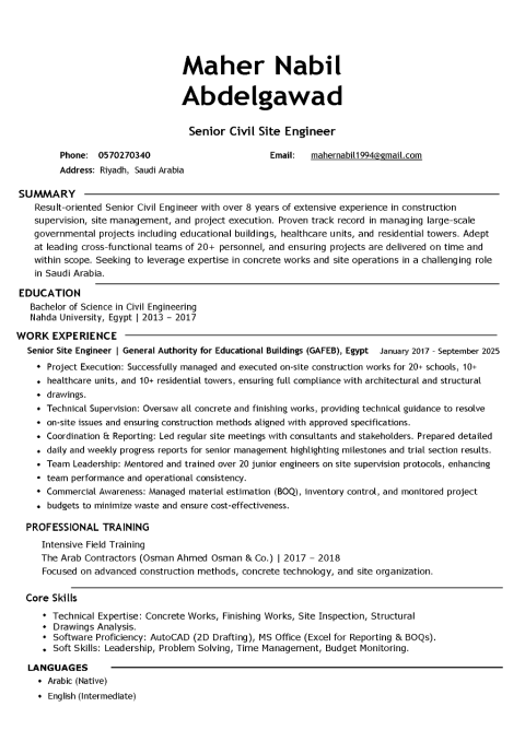 مهندس مدني موقع (Senior) خبرة 8 سنوات في التنفيذ - مهندس ماهر نبيل، جاهز فورا في الرياض. اشتغلت في كل حاجة تقريبا (أبراج سكنية، مدارس، مباني خدمية) شغلي كله في "التنفيذ" وإدارة الموقع. يعني استلم حدادة، نجارة، صب، وتشطيبات، وأتابع الصنايعية والعمال على لشان الشغل يطلع مضبوط وفي وقته. لو محتاج مهندس أمين وفاهم شغله ويدير لك الموقع تواصل معي