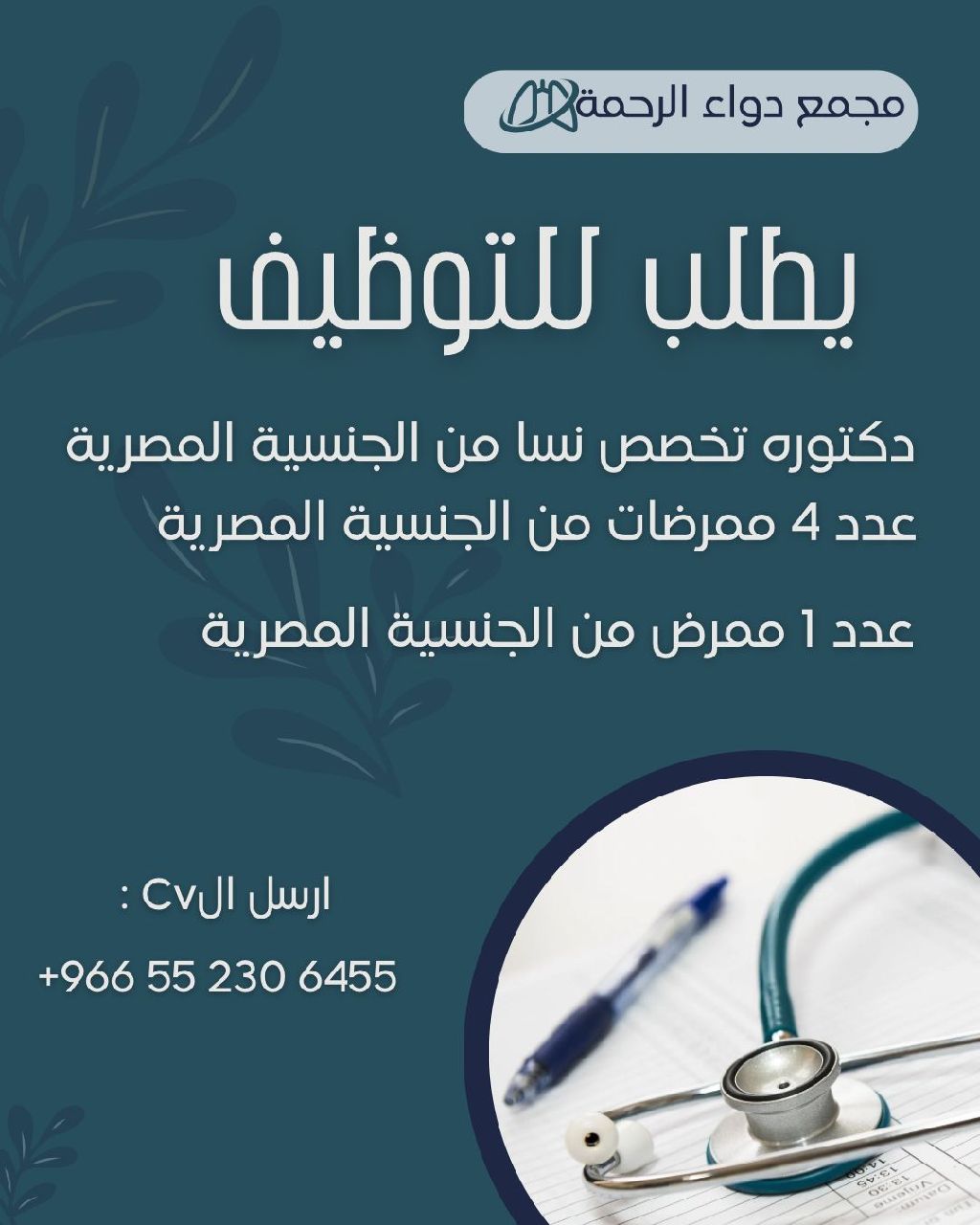 نبحث عن دكتورة نسا الجنسية مصريه للمجمع الطبي ونبحث أيضا عن 4 ممرضات من الجنسية المصريه وممرض أيضا من الجنسية المصريه