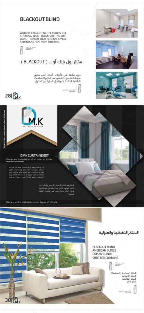 معكم مؤسسة دمك للستائر نقدم لكم أفضل حلول الستائر بجودة وكفاءة عالية ستائر رول ستائر أمريكية ستائر طبية ستائر زيبرا ستائر خشبية ومعدنية تصميم - تفصيل - تركيب باحترافية تواصل معنا الآن للحصول على استشارة مجانية وعرض يناسب احتياجاتك