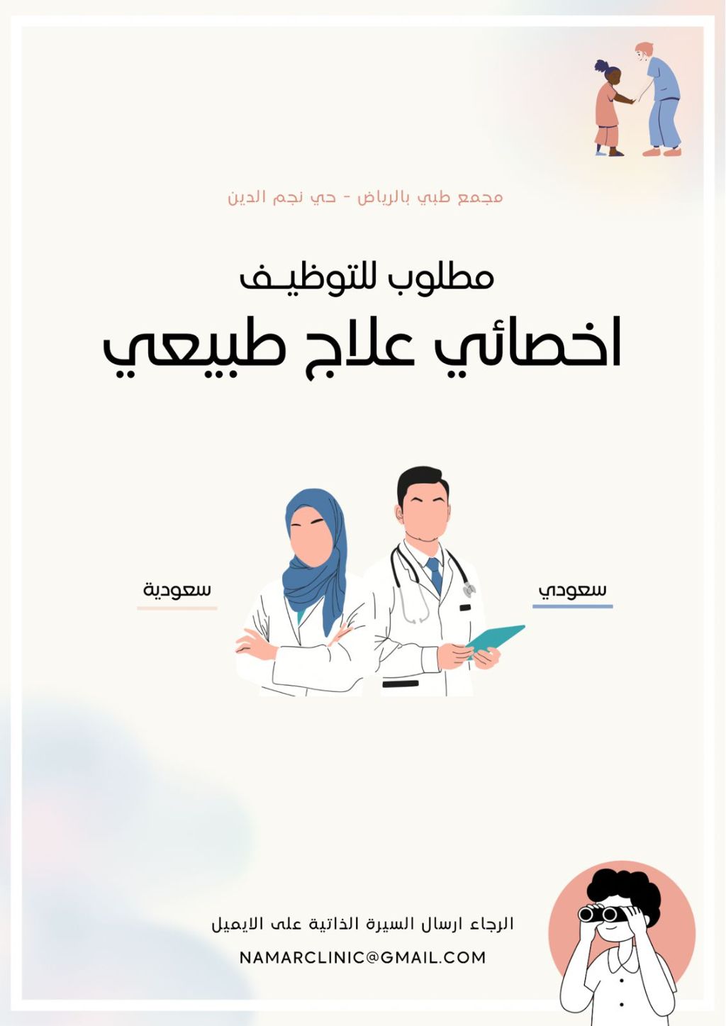 مطلوب بمجمع طبي في الرياض أخصائي علاج طبيعي سعودي أو سعودية فقط "حي نمار" الرجاء إرسال السيرة الذاتية على الايميل مع ذكر المسمى بالعنوان