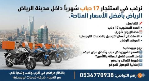 نحن شركة خدمات لوجستية ونرغب في استئجار 17 دباب شهريا داخل مدينة الرياض بأفضل الأسعار المتاحة. التفاصيل العدد المطلوب 17 دباب - مدة الإيجار شهري - الاستخدام أعمال التوصيل والخدمات اللوجستية - الموقع الرياض نرجو تزويدنا ب 1 السعر الشهري لكل دباب وأفضل عرض لديكم 2 هل السعر شامل الصيانة والتأمين 3 شروط التعاقد والدفع 4 امكانية التوصيل للموقع