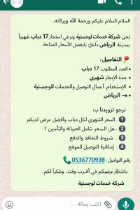 نحن شركة خدمات لوجستية ونرغب في استئجار 17 دباب شهريا داخل مدينة الرياض بأفضل الأسعار المتاحة. التفاصيل العدد المطلوب 17 دباب - مدة الإيجار شهري - الاستخدام أعمال التوصيل والخدمات اللوجستية - الموقع الرياض نرجو تزويدنا ب 1 السعر الشهري لكل دباب وأفضل عرض لديكم 2 هل السعر شامل الصيانة والتأمين 3 شروط التعاقد والدفع 4 امكانية التوصيل للموقع