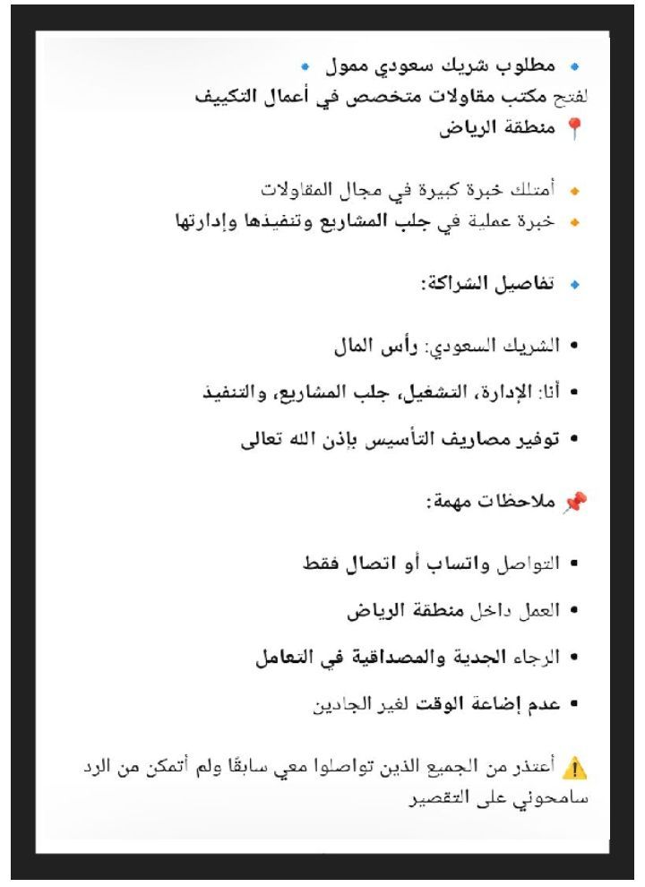 مطلوب شريك سعودي ممول لفتح مكتب مقاولات متخصص في أعمال التكييف منطقة الرياض امتلك خبرة كبيرة في مجال المقاولات خبرة عملية في جلب المشاريع وتنفيذها وادارتها تفاصيل الشراكة الشريك السعودي رأس المال أنا الإدارة، التشغيل، جلب المشاريع، والتنفيذ توفير مصاريف التأسيس ملاحظات مهمة التواصل واتساب أو اتصال فقط العمل داخل منطقة الرياض الرجاء الجدية والمصداقية في التعامل