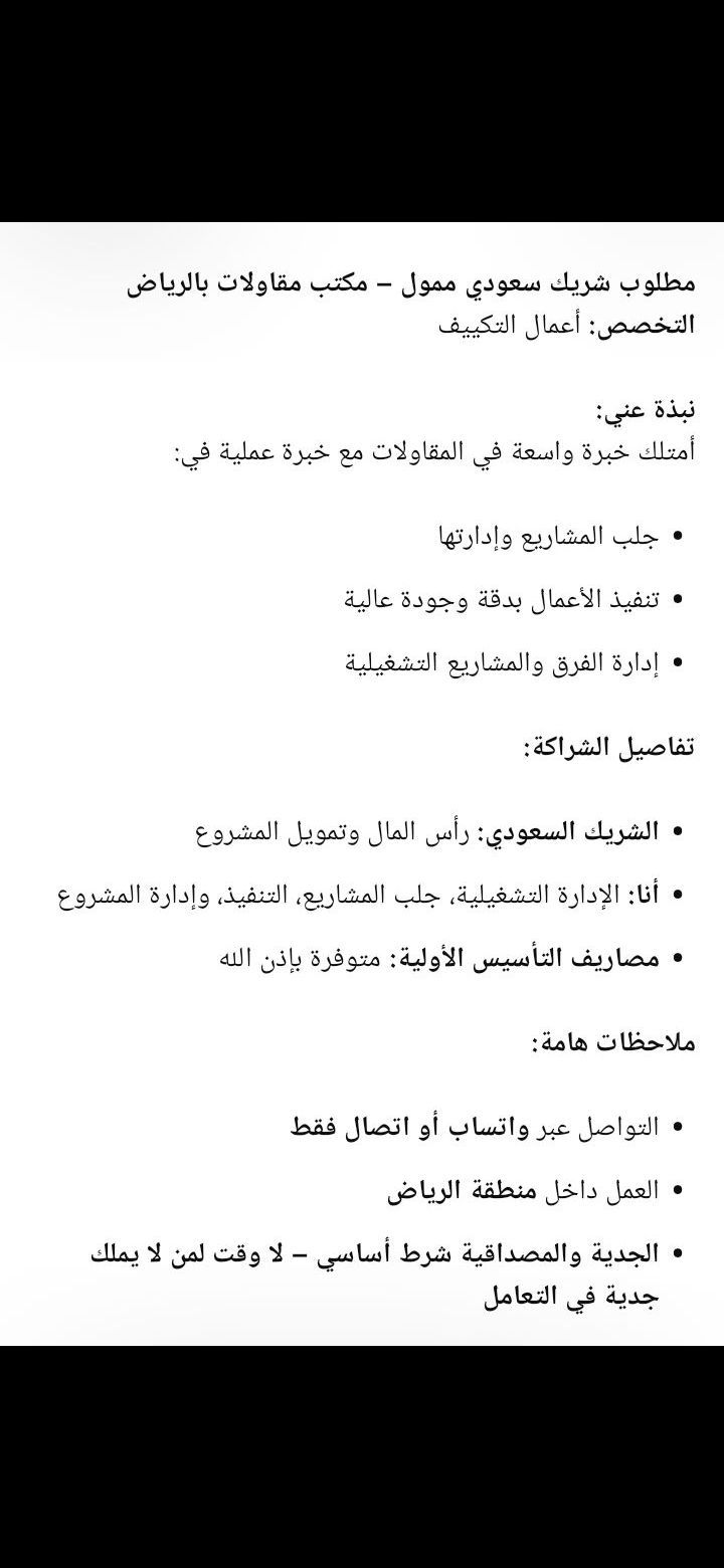 مطلوب شريك سعودي ممول لفتح مكتب مقاولات متخصص في أعمال التكييف منطقة الرياض امتلك خبرة كبيرة في مجال المقاولات خبرة عملية في جلب المشاريع وتنفيذها وادارتها تفاصيل الشراكة الشريك السعودي رأس المال أنا الإدارة، التشغيل، جلب المشاريع، والتنفيذ توفير مصاريف التأسيس ملاحظات مهمة التواصل واتساب أو اتصال فقط العمل داخل منطقة الرياض الرجاء الجدية والمصداقية في التعامل