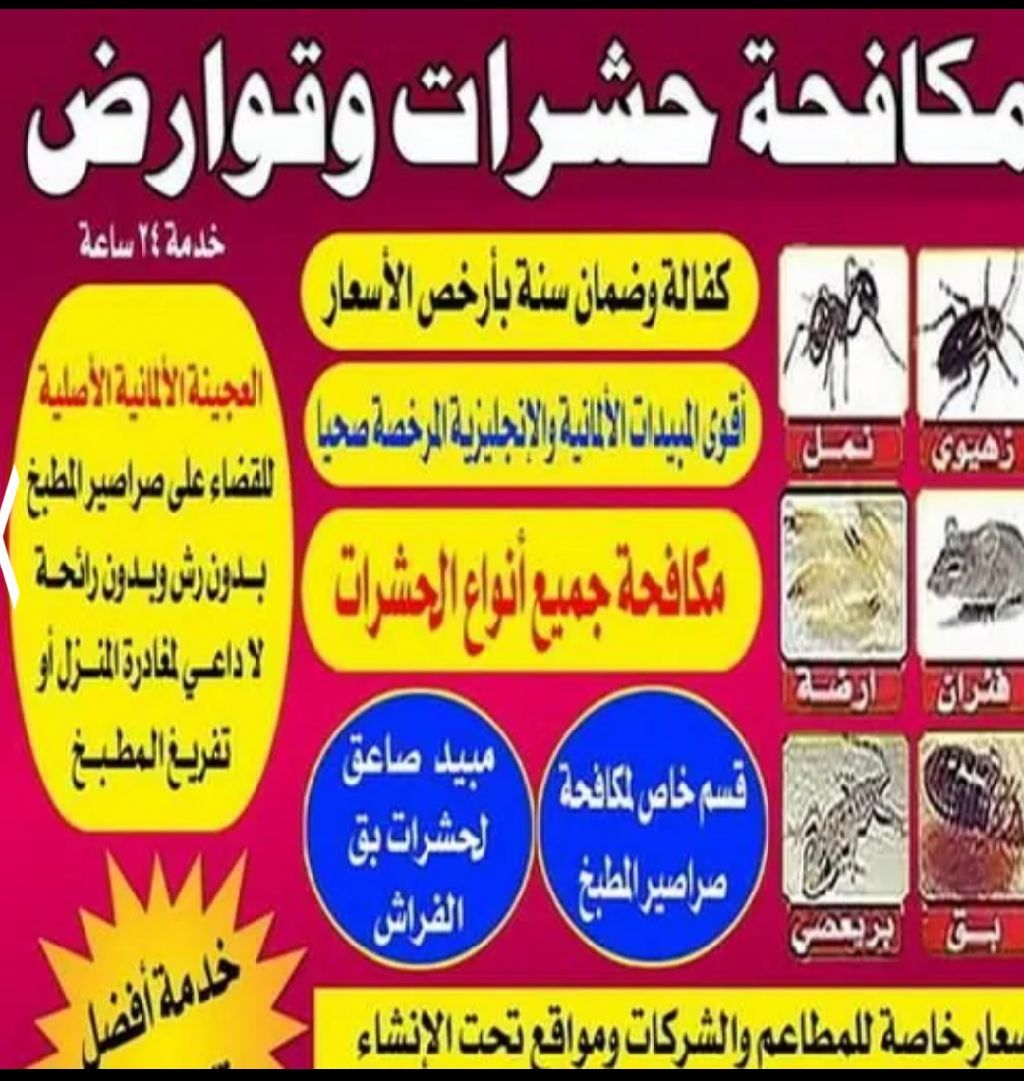 شركة التقنية الحديثة للخدمات العامة تقدم لكم رش مبيدات لمكافحة الحشرات مثل الصراصير النمل الأسود النمل الأبيض البق الناموس الوزغ رش الدفان والقوارض الثعابين ويتم العمل شهري وسنوي مع الضمان وبخصم 35% معنا بيتك نظيف وأمن من الحشرات والقوارض