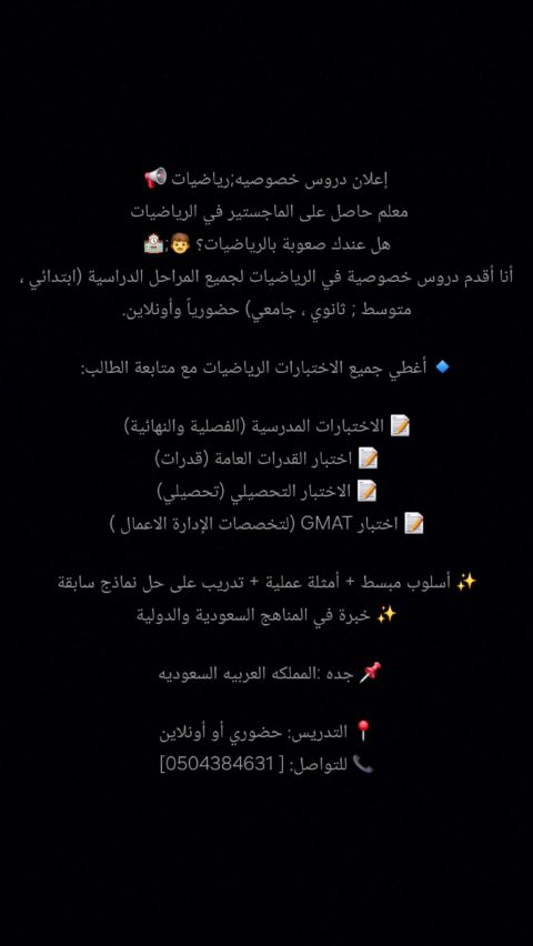 تدريس قدرات لفظي + كمي وتحصيلي اونلاين لمن يبغى يرفع درجته ويثبت نفسه بنتيجة تفتح له أبواب الجامعة. المدة 60 ساعة تدريب شهري السعر فقط 450 ريال شرح واضح - امثلة كثيرة - تدريب مستمر - متابعة خطوة بخطوة اللي يحتاج يبدأ هنا الطريق المختصر للدرجة العالية. للتواصل