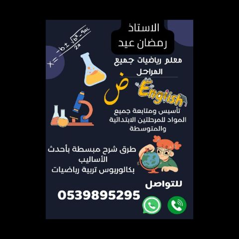 اعلان مدرس خصوصي لجميع المواد المدرسية (رياضيات - انجليزي - علوم - لغة عربية. للمرحلة الابتدائية (الأول - السادس) وكذلك معلم قرآن حافظ ومتمكن وخبرة في التعليم موجود في حي السعادة - الفيحاء. المميزات الاهتمام بالتأسيس من الصفر. تدريس التجويد ونور البيان والقاعدة النورانية. الجدية وتبسيط المادة والمتابعة للطالب. تدريس على كافة المناهج الدراسية مثل منهج الوزارة وسلاح التلميذ والمعاصر