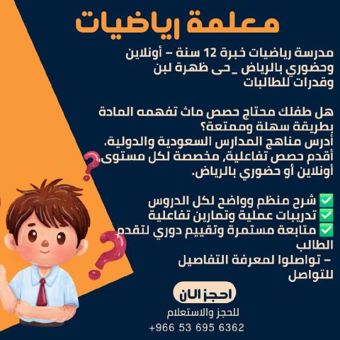 معلم متابعة (تخصص رياضيات) وقدرات كمي وتحصيلي موجود في الرياض بحي ظهرة لبن والمهدية وعرقة وأحياء الرياض، تدريس ومتابعة وتأسيس جميع المواد وجميع المراحل