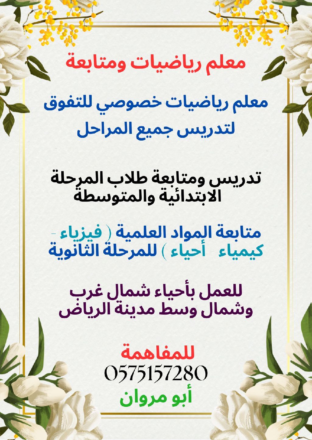 معلم تحصيلي أحياء للمرحلة الثانوية وتدريس الرياضيات لجميع المراحل ومتابعة طلاب المرحلة الابتدائية والمتوسطة في أحياء شمال وشمال غرب الرياض للمفاهمة