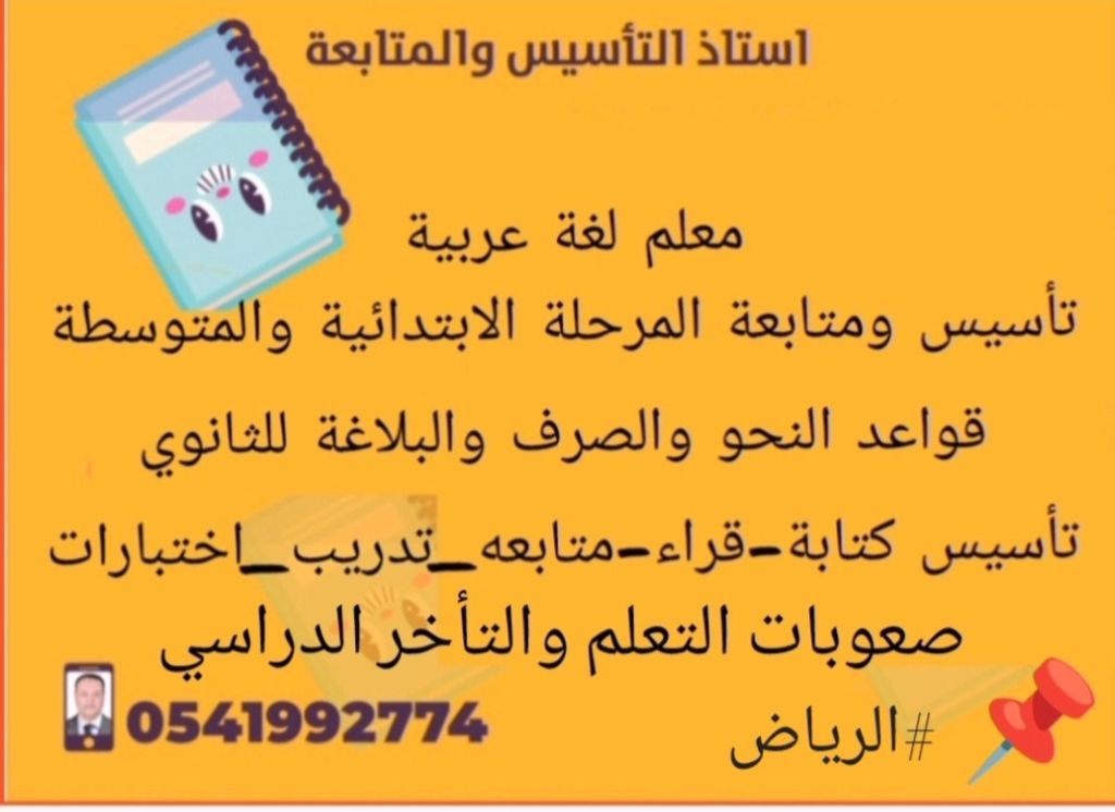 مدرس لغة عربية تأسيس ومتابعة الصفوف الأولية والعليا والمتوسطة. مدرس لغة عربية متخصص تأسيس من الصفر متابعة مستمرة خطوة بخطوة علاج صعوبات التعلم. تحسين القراءة - الكتابة - الإملاء أسلوب بسيط نتائج ملحوظة الهدف مش الحفظ الهدف الفهم + الثقة + التفوق فرق واضح من أول شهر مناسب لكل المراحل السعودي / شمال الرياض