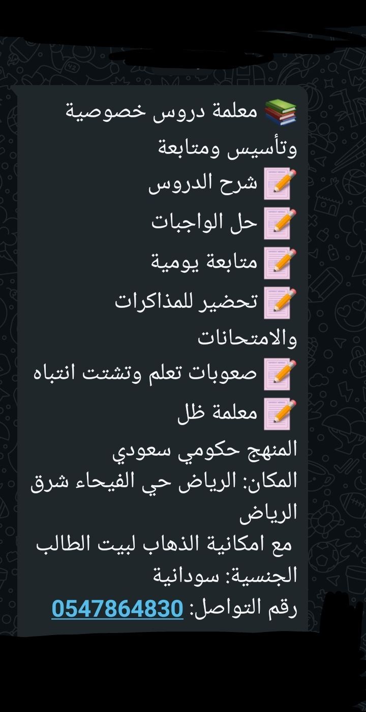 معلمة دروس خصوصية وتأسيس ومتابعة شرح الدروس حل الواجبات متابعة يومية تحضير للم ذاكرات والامتحانات صعوبات تعلم وتشتت انتباه معلمة ظل المنهج حكومي سعودي مع امكانية الذهاب لبيت الطالب سودانية التواصل على الرقم. الرياض حي الفيحاء السلام السلي النسيم الغربي الجزيرة شرق الرياض