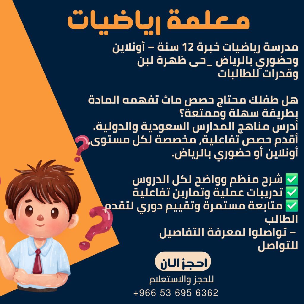معلمة رياضيات وماث خبرة طويلة بالمناهج العالمية من أمريكي وبريطاني اعطي الحقيبة كاملة لطلاب الانترناشونال من جريد 1 الى جريد 10 المكان حي ظهرة لبن في الرياض أو اونلاين